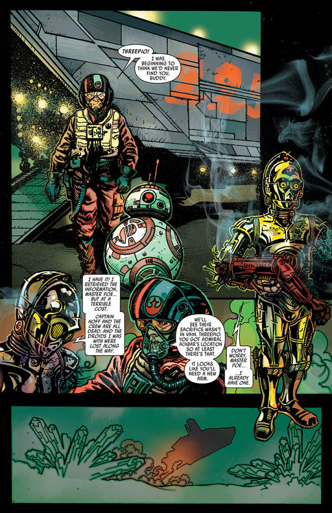 ▼ 至於為什麼C-3PO 的手臂是紅色的呢? 去年發行的劇情補完漫畫《STAR WARS:C-3PO》解開了這個謎。 為了執行反抗軍的任務,C-3PO 與一群機器人不幸墜毀在某個星球上。