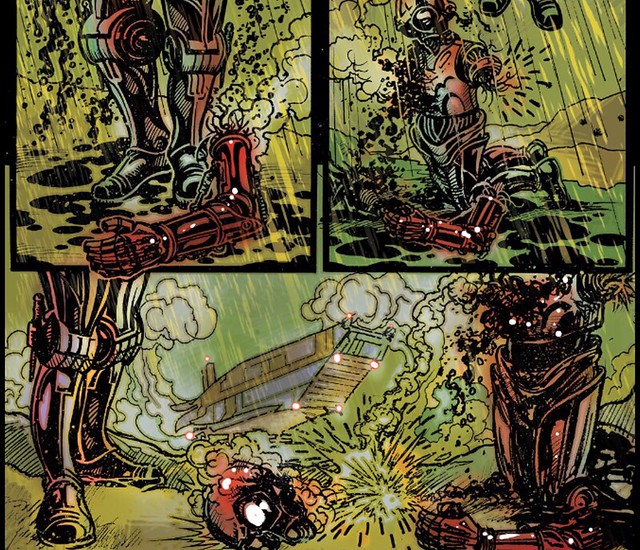 ▼ 沿途上機器人伙伴們不斷地犧牲,最後僅剩下C-3PO與一個叫做Omri 的機器人。 後來兩人遭遇了強烈的腐蝕酸雨而躲到掩體之下,為了在酸雨將掩體也腐蝕貽盡消滅兩人之前,Omri 犧牲了自己走到酸雨中啟動求救訊號,最終因酸雨的侵蝕而導致晶片燒毀而毀滅。 也因為酸雨的侵蝕,揭露了Omri 的銀色烤漆之下,原本是紅色的模樣。