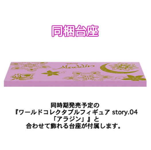 這次系列第四彈的將收錄有主要動畫裡面所出現的角色人物「阿拉丁」、「茉莉公主」、阿拉丁的寵物夥伴「阿布」、鸚鵡「艾格」還有反派角色「賈方」等等六種類,「神燈巨人」(Genie)則是收錄在較大尺寸的「MEGA」WCF系列當中,同樣都附有一個較大尺寸的底座,可以讓眾多角色集合起來構成場景的模樣,「MEGA系列」的都會推出有兩款不一樣的配色,來提供玩家可以自行選擇想入手的顏色,喜歡《阿拉丁》的玩具人千萬別錯過了歐!