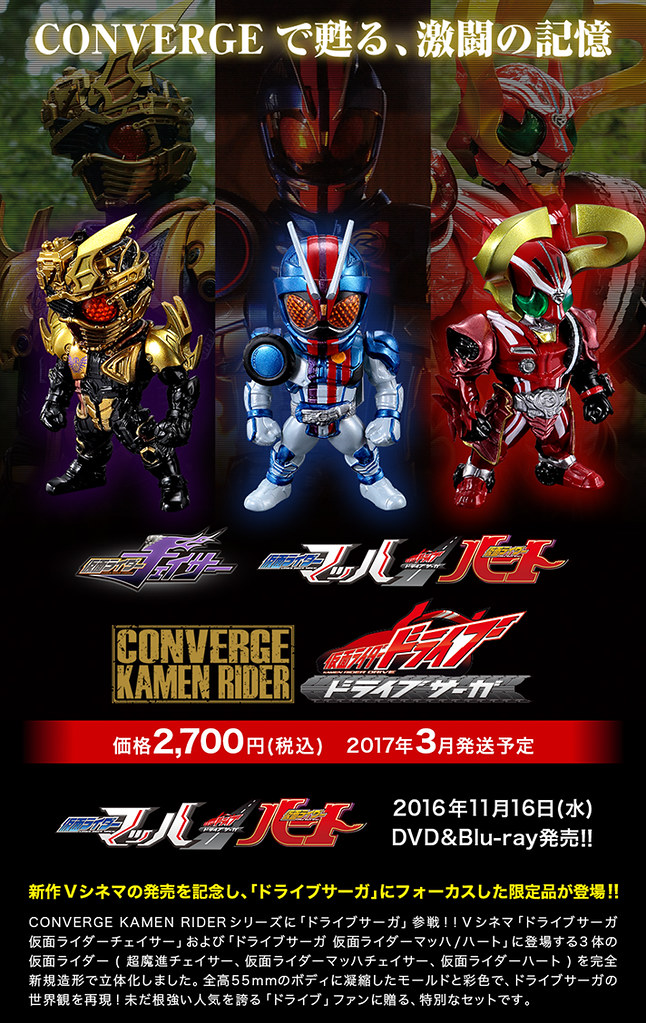 日Bandai萬代玩具公司的食玩事業部門以《假面騎士》為主題推出「CONVERGE系列」盒玩之作,已經推出了「第一彈」、「第二彈」、「第三彈」和「第四彈」、「第五彈」以及「-AGITΩ覺醒-」等等多款盒玩作品,相當受到喜歡假面騎士玩具人們的歡迎,此次將繼續推出《Drive SAGA》外傳篇章所登場的騎士角色們。