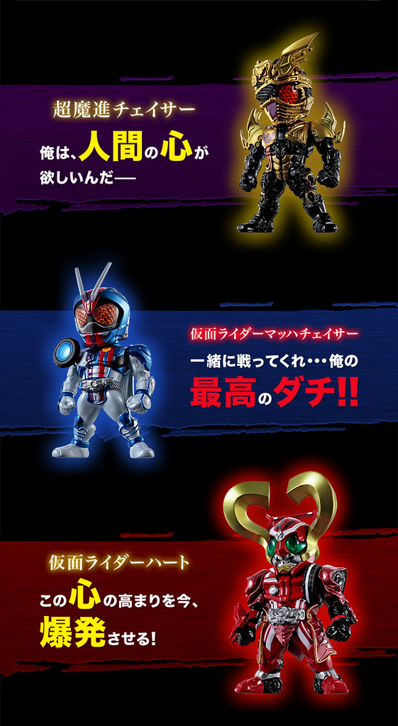 將收錄《Drive SAGA》系列的第一作「假面騎士Chaser」所登場的『超魔進追跡者(超魔進チェイサー)』,以及第二作「假面騎士Mach/假面騎士Heart」所登場的『假面騎士Mach Chaser(仮面ライダーマッハチェイサー)』、『假面騎士Heart(仮面ライダーハート)』等等三位角色人物,三款人物都相當注重身上盔甲和身體線條等等的多處細節,眼部也是運用透明材質來呈現,十分強調精緻的造型不會因為縮小而放棄身上的細節刻紋,喜愛《假面騎士》CONVERGE 盒玩系列作的玩具人可以參考一下歐!
