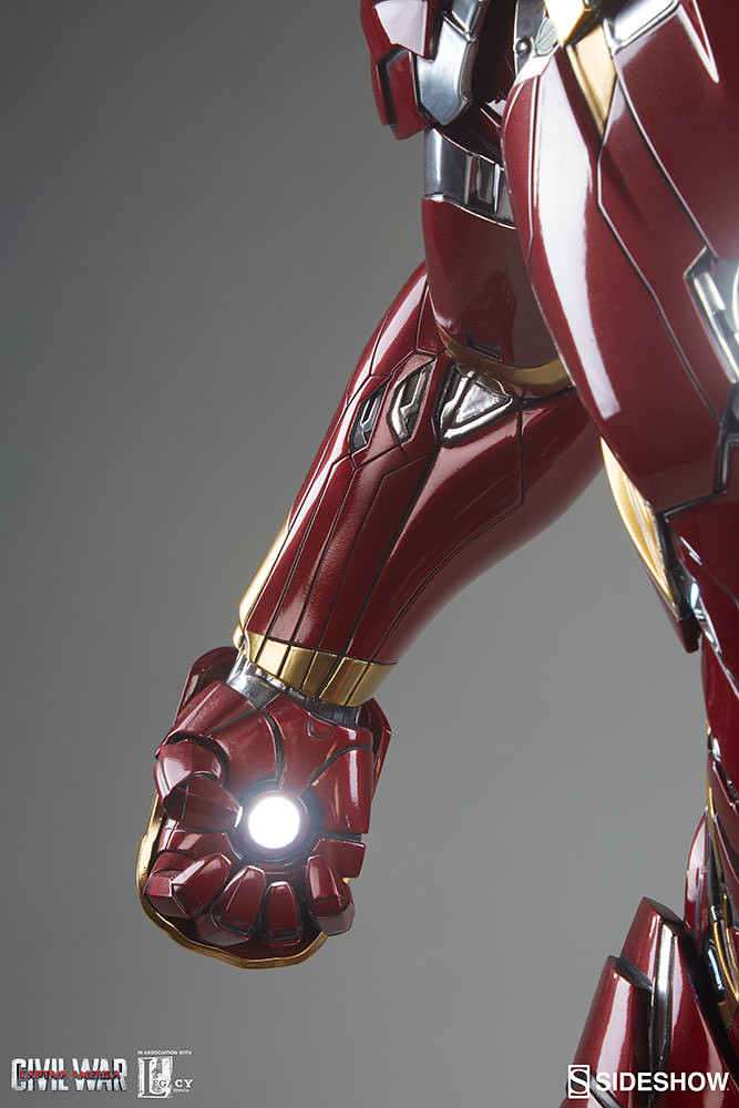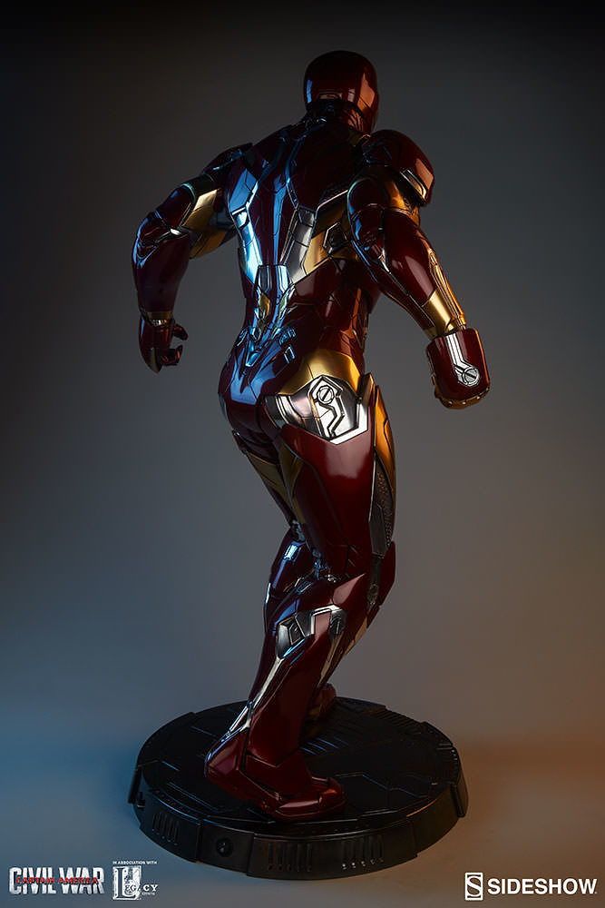 這次所要推出的「馬克46」傳奇系列雕像作品全高約96.52 公分,採用polystone、玻璃纖維(fiberglass)、金屬以及許多高級材質,將電影美國隊長3:英雄內戰中馬克46 的造型完整呈現,打造出這一款霸氣十足、華麗細節的1/2 比例超巨大雕像作品。