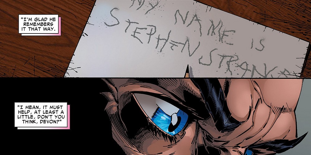 史傳奇試圖用受傷的手來寫字,導致看起來像小孩子寫的,這也是致敬漫畫故事"Strange"中的場景。
