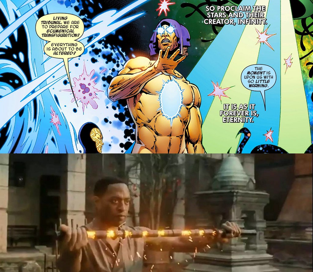 莫度開始訓練史傳奇戰鬥時,講述可以將魔法能量注入在物體裡,然後提到生命法庭這個字眼。生命法庭是漫威宇宙第二強的存在,為多元宇宙的神,負責掌管多元宇宙的平衡,不過這彩蛋目前先當作只是名字被採用,而非這個角色往後會登場的暗示比較好。此外莫度穿的靴子其名字Valtorr,也是參考一個宇宙神,但目前也是看成名字被提到的彩蛋就好。