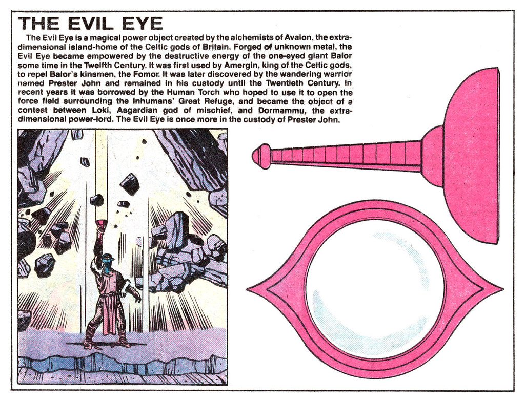 當奇異博士再跟卡西流斯戰鬥時,拿起一個道具讓卡西流斯有點緊張,結果才發現史傳奇不會使用,而這魔法道具名叫The Evil Eye(邪眼),擁有強大的能量來做攻防兼備的作用。通常的持有者為一個13世紀出生的騎士Prester John,並在早期的故事中成為捍衛者連盟與復仇者聯盟互相鬥爭的原因。