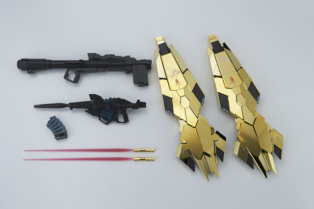 「PG 1/60 獨角獸鋼彈3號機 鳳凰」的結構大致與前兩機相同,新開模的不死鳥羽翼天線同樣內藏磁石,變形起來方便也能有絕佳密合度。金色裝甲部份完全經過電鍍處理(電鍍零件的湯口要小心地用兩段剪處理喔!),呈現閃閃發亮的金色,而精神感應框架則使用明亮的水藍色透明零件成形,武裝部份除了麥格農光束步槍、超絕火箭炮和光束軍刀外,當然還有背部的兩面「武裝戰甲DE」囉!完全變形展開後模樣看起來魄力十足啊!
