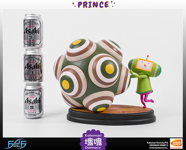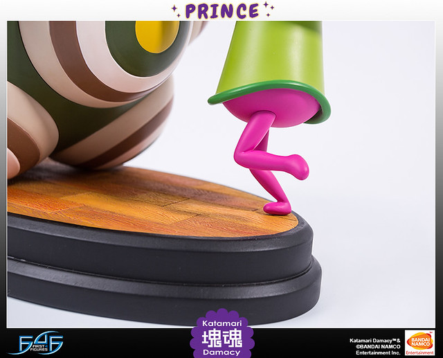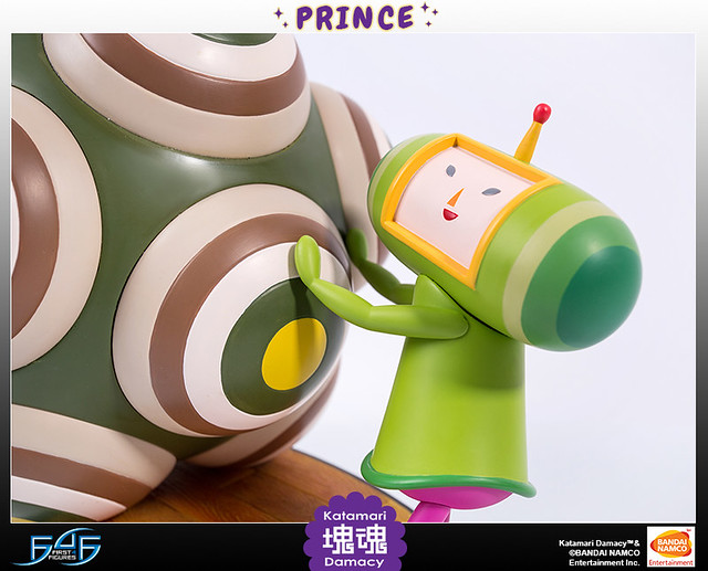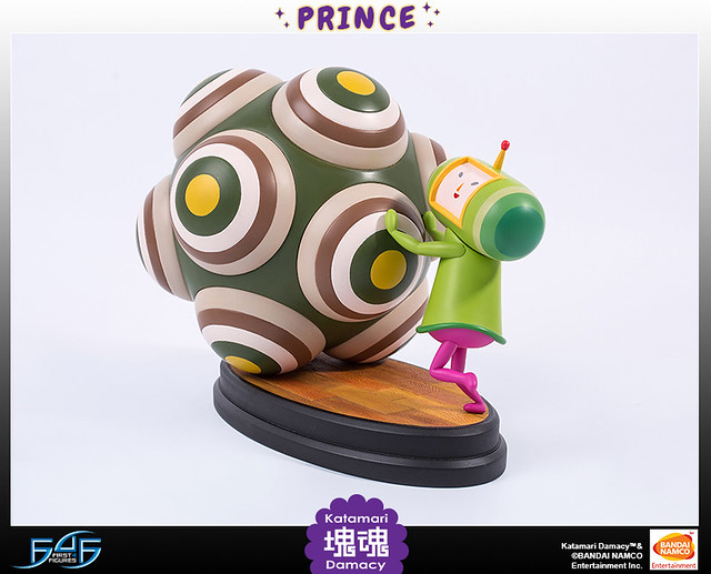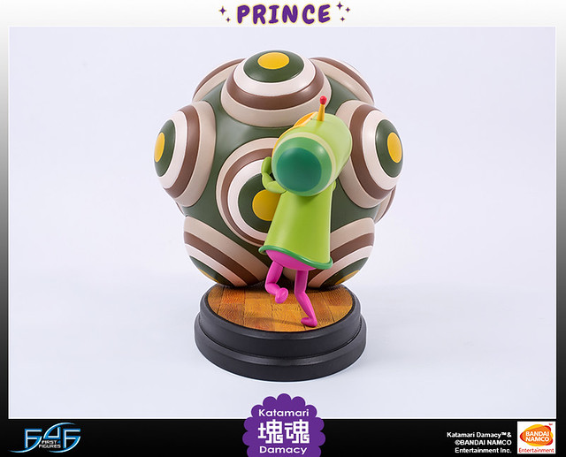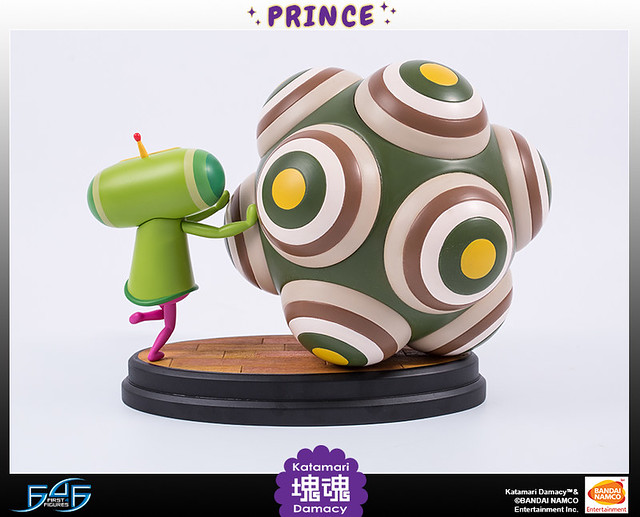 FIRST4FIGURES推出的塊魂王子雕像高約11吋,巨大的塊魂本體與嬌小的王子形成對比,讓人回想起瘋狂滾球的遊戲時光。造型上還原了洗練可愛的風格,人物動作生動,塊魂特殊的造型經過立體化後,那種巨大感更是令人滿足。色彩使用上也呈現出原作中鮮艷大膽的配色。底座是橢圓形的木地板,木板與木板間的縫隙也仔細地雕刻出來,非常精緻。