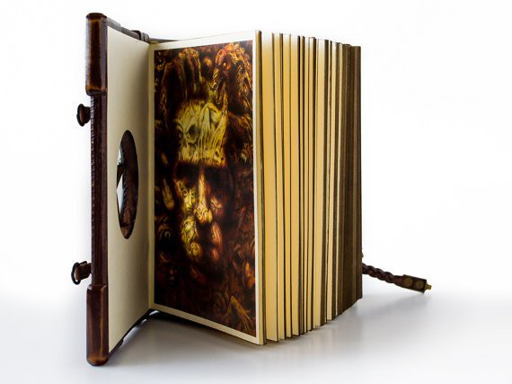 這一個名為「aLexLibris」的Esty 商店,販售著各種極具奇幻、魔法風格強烈的魔導書造型筆記本。使用真皮與木製的封面,中間鑲有手工鍛製的五芒星、人骨造型以及充滿各種意味的「穿刺公」弗拉德三世畫像。 筆記本中的紙材特別挑選極具氛圍的奶油色材質,並以咖啡施以舊化令其充滿古老質感,每一本都讓小編心中的暗黑魔力蠢蠢欲動啊~(中二心燃燒)