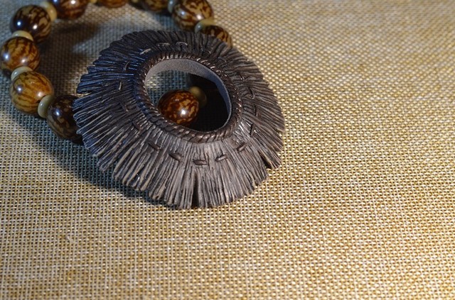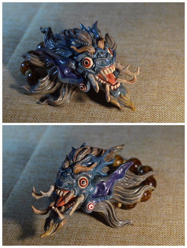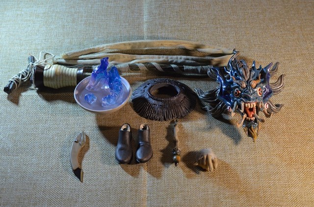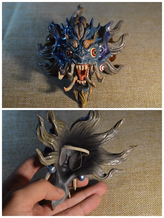 ▲面具。類似於某種儀式的面具,這種像龍又像鬼神的造型,真的既另類又很有視覺衝擊。面具的整體塗裝很到位,毛髮的分色處理以及紋路的一些細微的塗裝都不馬虎!為了防止人物臉型與面具磨損掉漆,面具背面很貼心的加入了海綿。另外要說明一點,面具雖然比較重手,但是戴在頭上絲毫不會產生垂墜感。