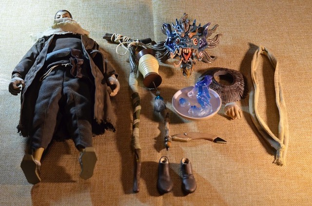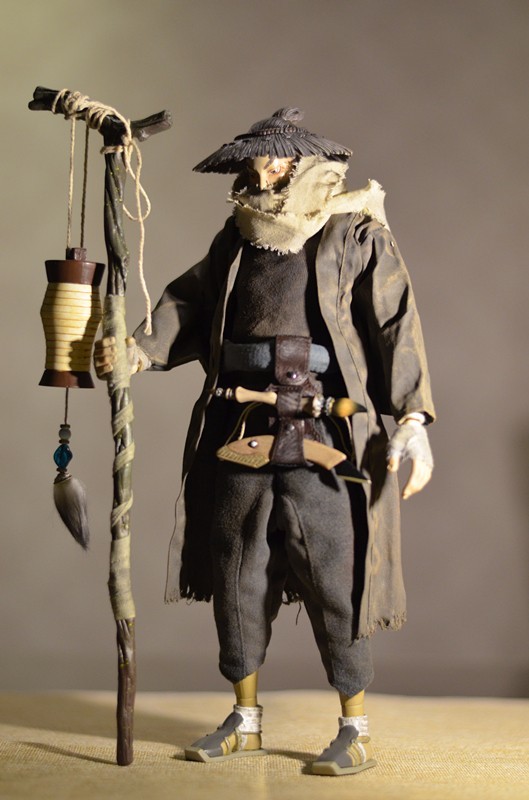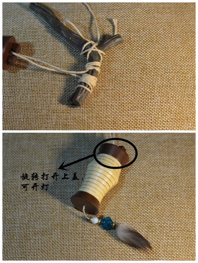 ▲手杖。手杖塗裝很不錯,軟膠的材質,做出了木頭的質感,紋路上還額外增加了一些做舊的痕跡,很不錯。手杖的上面的布帶以及繩子纏繞的看似不規則,卻非常有感覺,有一種淩亂美。燈籠的塗裝看似很厚,其實很薄,開燈的效果很贊,淡黃的光。燈籠下的吊墜做的很驚喜。開燈的方法是,將燈籠上方的蓋子旋開,然後打開控制開關即可。