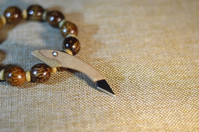 ▲刻刀。對於這款旅人來說,我認為這款刀,並非武器,而是生活用品。塗裝方面,中規中矩,刀刃和刀身的分色做的很好,遠看以為是金屬刀。刀柄的塗裝算是不錯,刀尾部的金邊,也起到點睛的作用。