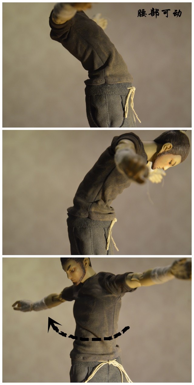 這款可動性很不錯,而且素體的品質非常的好,各種部位都很結實!可動如下圖。頭部360度可動,後仰低頭的角度也不錯。腰部360度都可旋轉,手臂雙關節可動也很好,大腿有礙於垮褲,分叉的角度不是很大,但是抬腿以及卷腿的幅度還是可以的。腳部的接地性也是相當不錯。