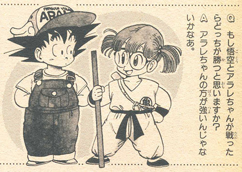 ▼ 這一個插畫,出自於多年在鳥山明老師在單行本中回答粉絲“悟空與阿拉蕾誰比較強?”的問題所使用的插畫。