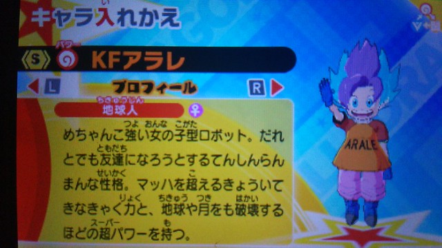 ▼ 3DS 遊戲《七龍珠融合》(ドラゴンボールフュージョンズ)中,能夠讓多種七龍珠角色與原創角色合體來對戰。 其中就出現了超級賽亞人孫悟空與阿拉蕾融合之後的造型。