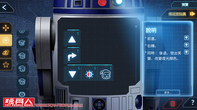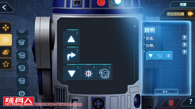 ▼ 基本遙控模式。 包含了前進、後退、左右轉彎與轉頭...等各種機能外,也能夠遙控R2-D2發出各種音效來表達不同的情緒,或是播放經典的星際大戰配樂。