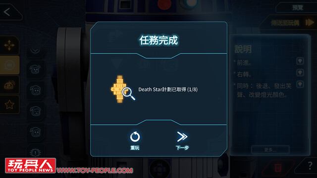 ▼ 遙控模式的第三個模式“程式設計”,各位玩家們在任務模式中學習的就是“程式設計”的操控方式。 除此之外,藉由任務模式中的進度,也能夠為此模式解開更多的新機能! 努力的挑戰任務模式,收齊死星計畫,也補完R2-D2的所有遙控機能吧~