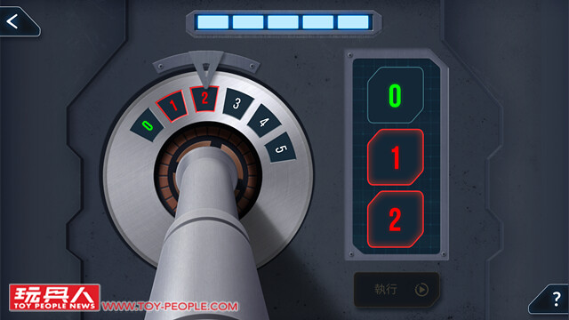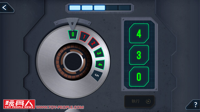 ▼ 破解密碼的介面。 上方的五個燈代表還能夠嘗試的次數;紅色代表錯誤的密碼數字;綠色字代表正確的密碼數字,但位置不對。 綠色字加綠色外框就是密碼數字與位置都正確。