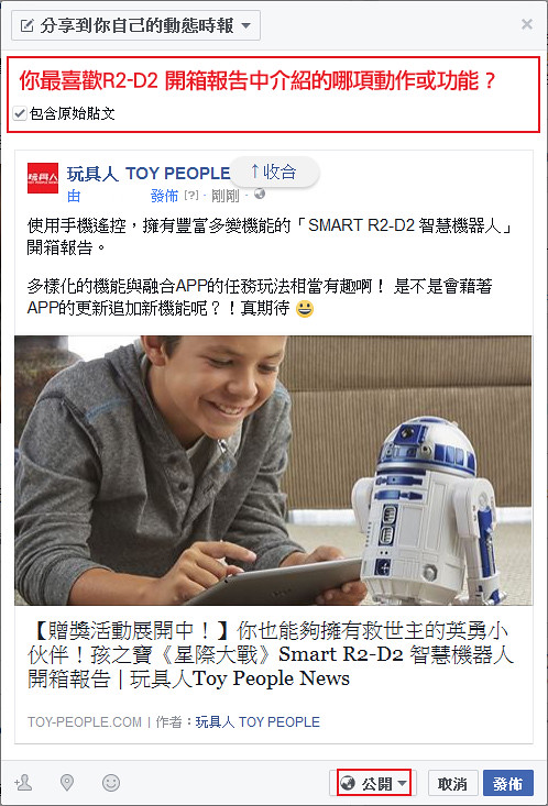 2. 將連結分享到你個人的Facebook 塗鴉牆,請寫下回答“你最喜歡R2-D2 開箱報告中介紹的哪項動作或功能?”(權限記得要設定成公開,不然小編無法檢查你是否貼文,那就無法中獎嘍~)