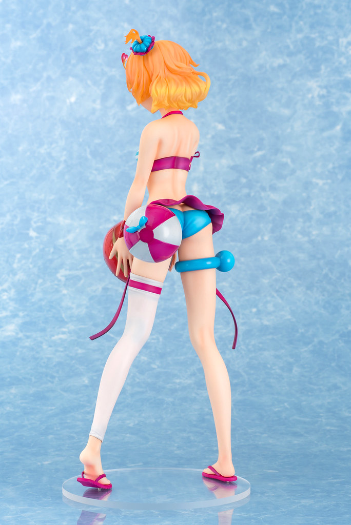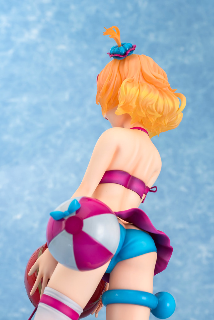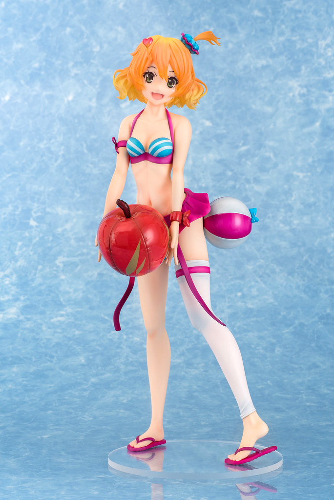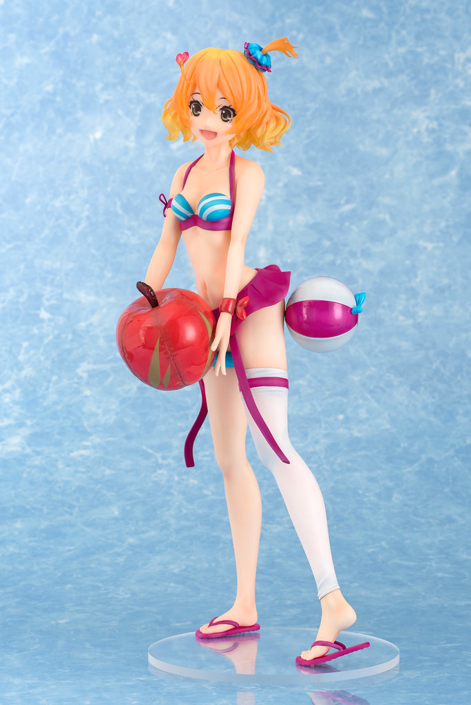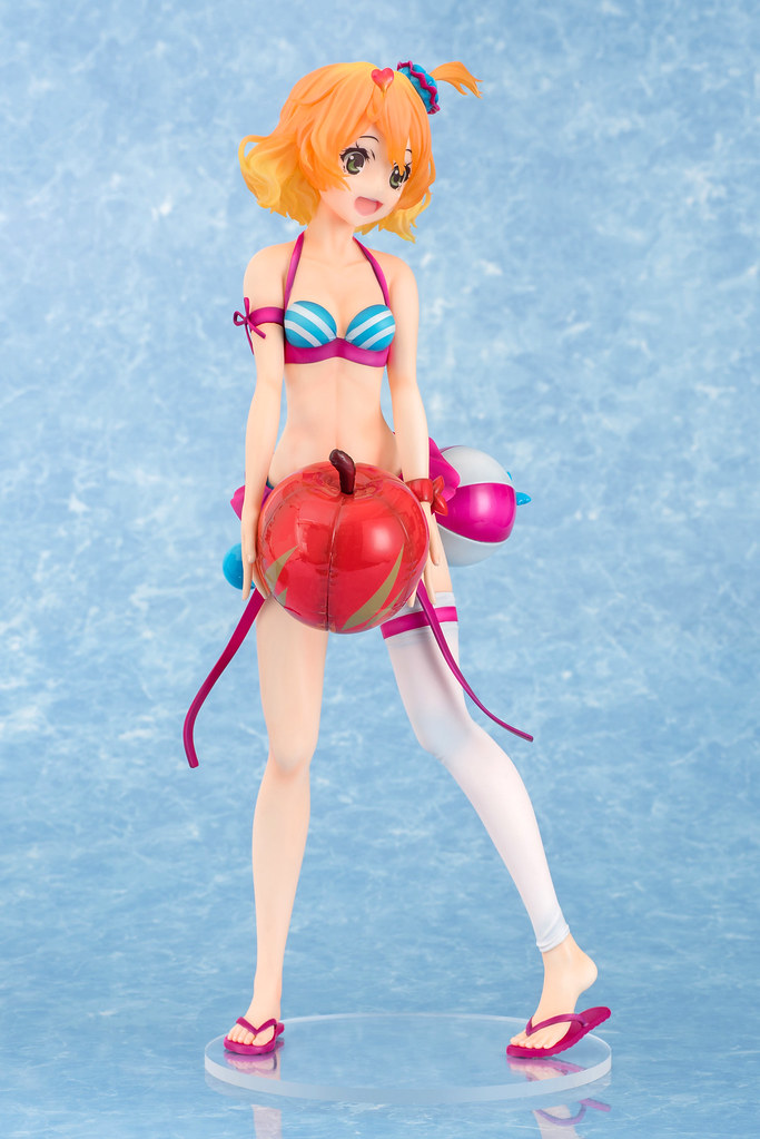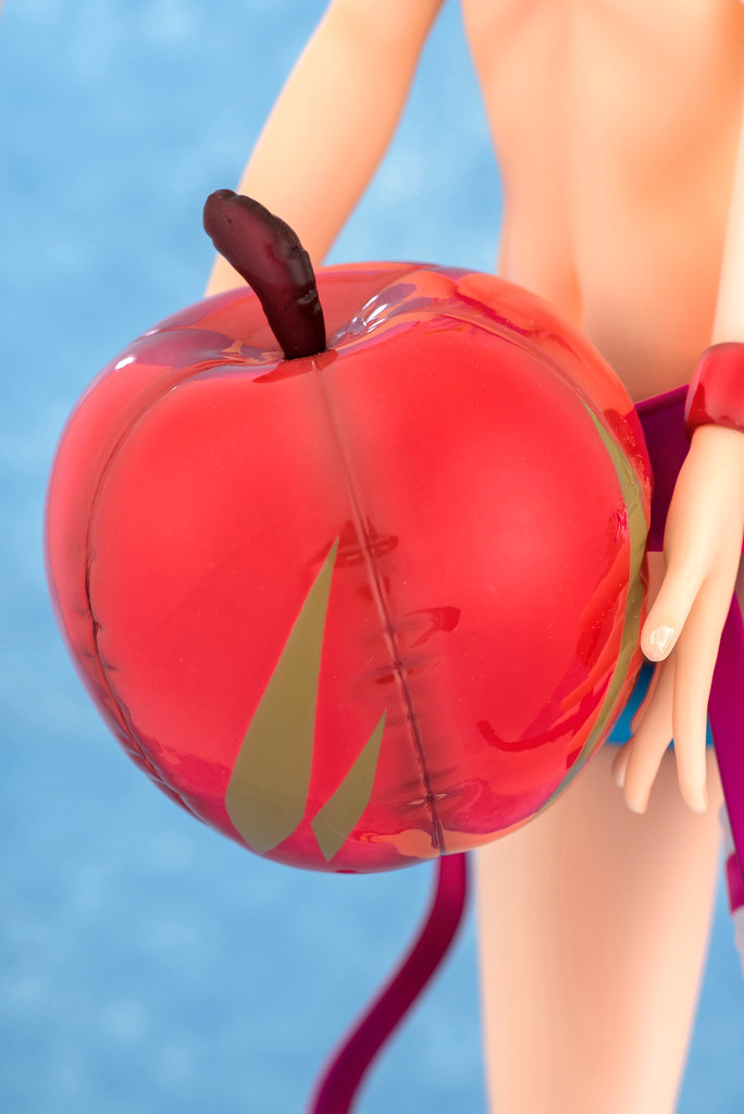 「芙蕾雅·薇恩 1/4 泳裝FIGURE」全高約39公分,在巨大的比例下將芙蕾雅穿著泳裝的纖細身材立體化,頭髮部份使用透明材質製作,呈現光澤蓬鬆的髮質,連愛心型的「Rlung」都閃閃發亮了!手中捧著的充氣蘋果不但有塑膠布的高光澤,上面的縫線、凹陷都真實地製作出來。芙蕾雅的泳裝以紫、白、水藍三色構成,樣式非常可愛,臀部還掛著浮球喔!搭配芙蕾雅招牌的活力笑容,讓人充滿了元氣啊~~
