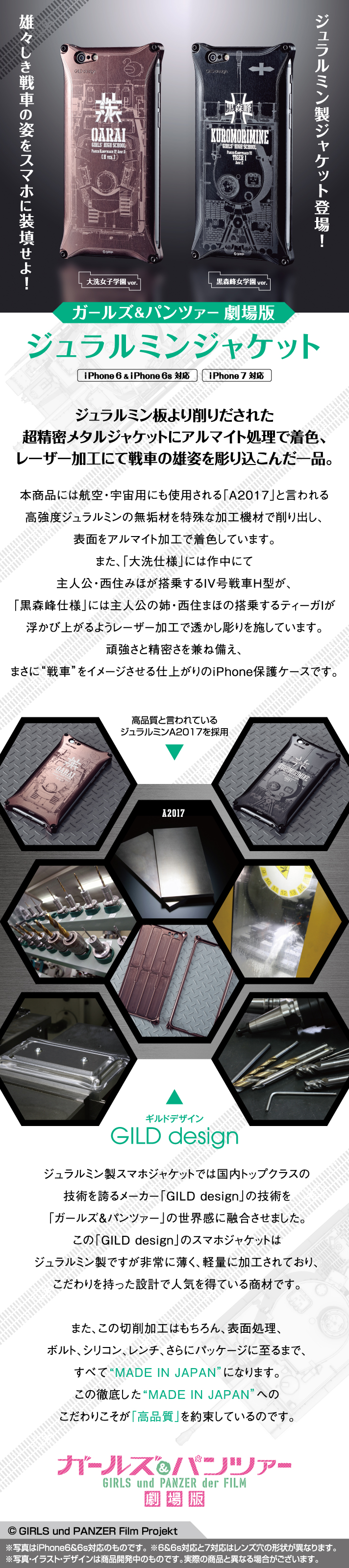 由萬代南夢宮娛樂(BNEI)營運,專門販售動畫《少女與戰車》角色商品與週邊的大型企劃商店「少女與戰車 劇場版 Chara Pop Store(ガールズ&パンツァー 劇場版 キャラポップストア)」昨(24)日發表了新商品,與手機殼製造商「GILD design」合作的「《少女與戰車 劇場版》鋁合金機殼」(ガールズ&パンツァー劇場版 ジュラルミンジャケット)已在Premium BANDAI線上商店開放預購的消息,並釋出詳細商品資訊及預覽圖。