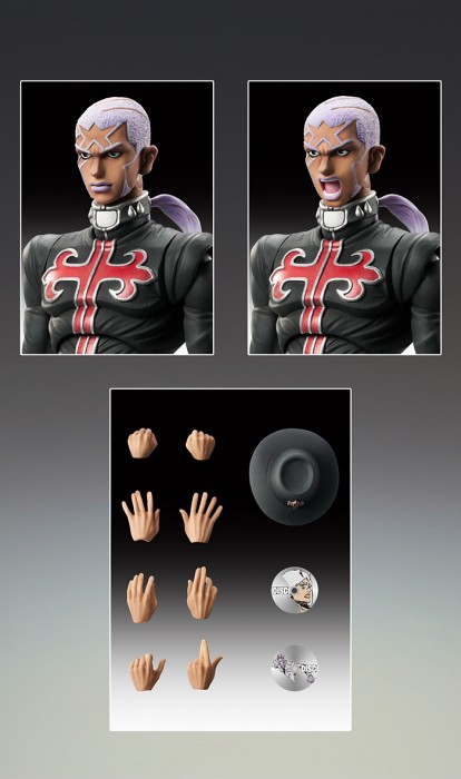 有別於之前"藍紫色"的服裝版,這次把漫畫裡面神父都穿著黑色的版本與顯眼的紅色十字架來製作,另外還多附有經典對白配件,與多款可替換手首和不同表情頭雕可以替換,此作將在會場以"500個"數量先行抽選來販售受付,有興趣的玩具人可能要特別前往日本WF祭典展覽排隊購入了啊!喜愛《JOJO的奇妙冒險》超像可動系列的玩具人可以參考一下歐!