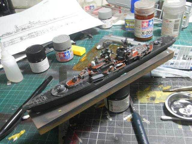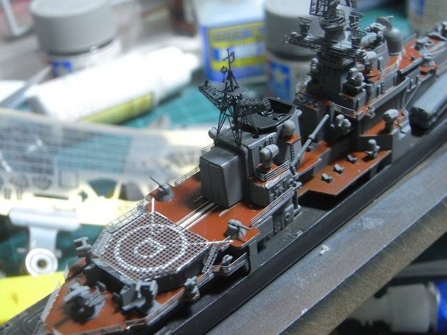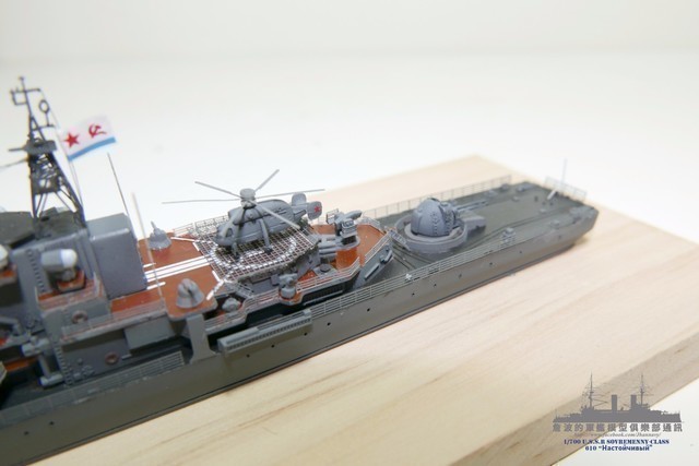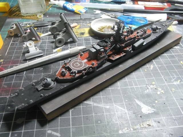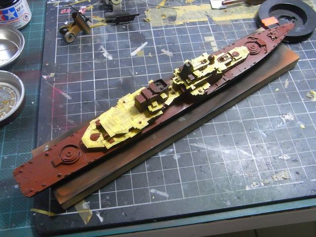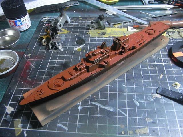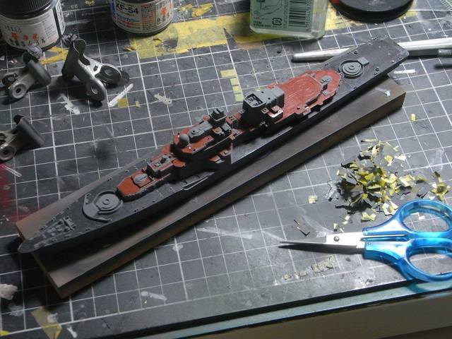 ↑細節工作完成後噴上底漆與甲板色,俄系軍艦的紅色甲板真是魅力無窮