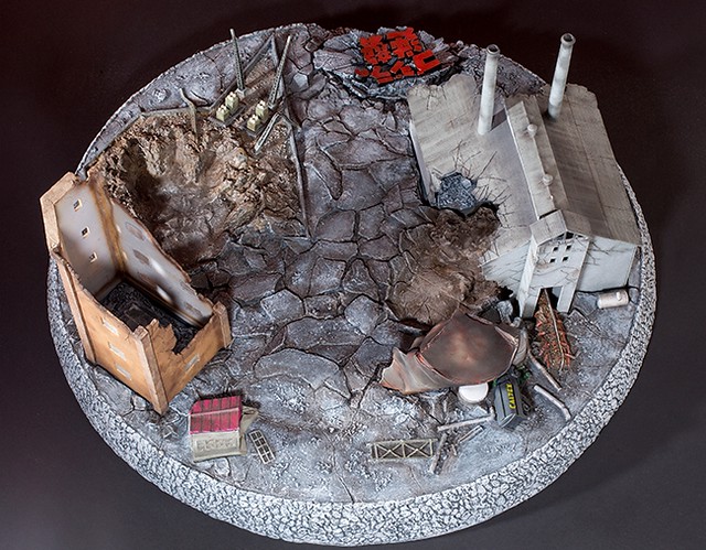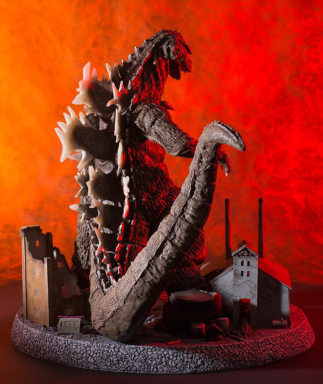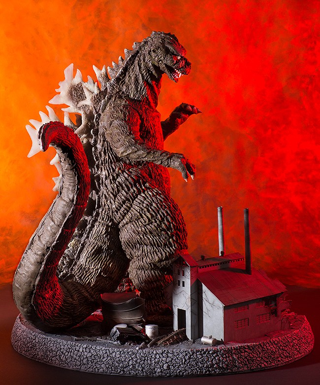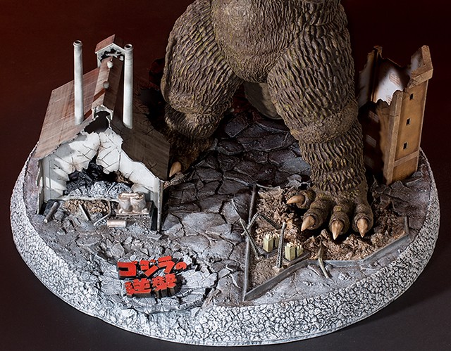 這次所發行的作品,是「PLEX」所發行的歷代作品中最大型比例的作品,將暱稱為“逆ゴジ”的哥吉拉,濃縮於60cm 比例並搭配上直徑60cm 的場景地台。 哥吉拉的配色將以當時人工上色的海報上的紅褐色印象來作為配色,並將爪子、牙齒與眼球使用不同的零件製作,更加提升生物的逼真質感;搭配上哥吉拉與安基拉斯在大阪此花區工廠地帶戰鬥的場景地台,遭到踐踏的工廠、破損的石油槽...等,呈現出原作中的激戰氛圍。