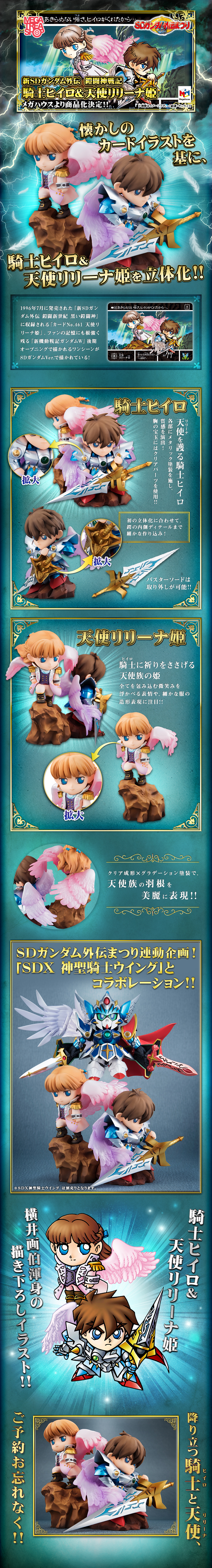 「騎士希洛與天使莉莉娜公主」作品不論是色彩或是造型都忠實還原了1996年7月發售,收錄在《新SD鋼彈外傳 鎧闘神戰記 黑色鎧闘神》的「No.461 天使莉莉娜公主」。這張卡使用了讓粉絲印象深刻,《新機動戰記鋼彈W》OP2中希洛與莉莉娜背對背的名場景。希洛身上的鎧甲與劍等各個細節有著精密造型,部份鎧甲也使用金屬塗裝增加質感。兩人的翅膀則使用透明材質加上漸層塗裝,呈現珍珠般的光澤。搭配先前發表的「SDX 神聖騎士飛翼鋼彈」一同擺設更能展現華麗的場景!