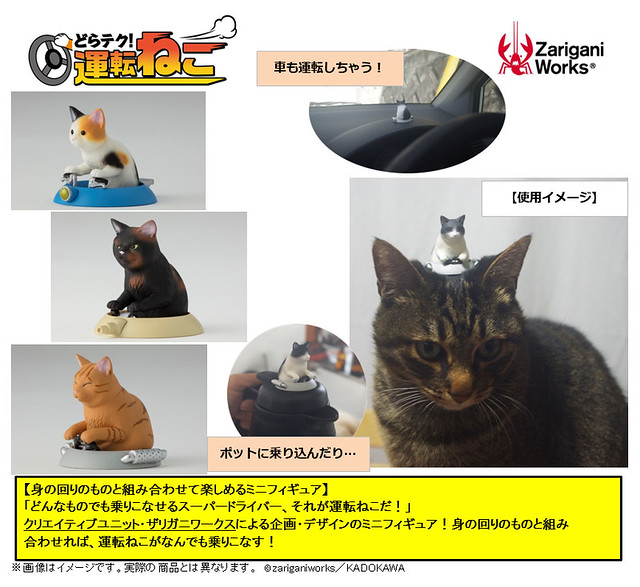 日本角川出版社KADOKAWA,繼大報紅的LINE貼圖立體化轉蛋「死魚眼布偶裝」(目が笑ってない着ぐるみたち/Dear animal costume)之後,又宣布將推出一款爆笑盒玩「運轉貓!」(どらテク! 運転ねこ)。