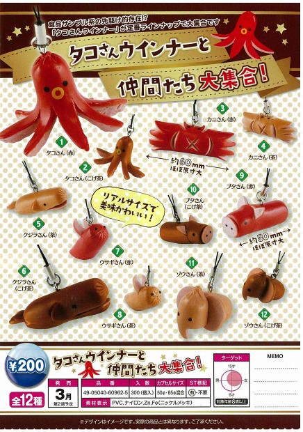 2017年3月10日新增官方宣傳照片與販售相關資訊,預計在這個月份所推出的「香腸章魚&愉快的伙伴們大集合!」,官網近日公開其大張清晰的宣傳照片,有"香腸章魚"、"香腸螃蟹"、"香腸鯨魚"、"香腸兔子"、"香腸豬"與"香腸大象"等等六款由香腸所製作成的逗趣動物,其中還有特別利用「香腸末端」的部位,來成為"兔子的嘴巴"或是"鯨魚的嘴上方"的模樣實在是十分具有巧思!常做孩子便當的玩具人對這套轉蛋作品一定相當有感的啊!