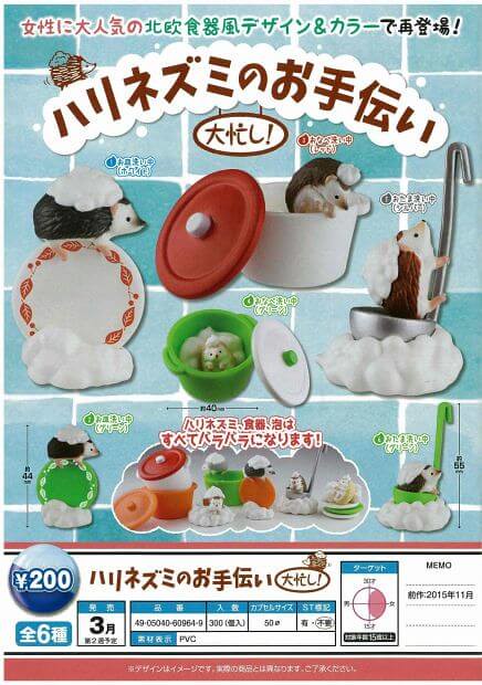 2017年3月23日新增官方宣傳圖片與販售相關資訊,之前也有以"刺蝟"為題材推出過「刺蝟小屋」或是「杯緣刺蝟」等等關於這個新萌寵"刺蝟"題材的轉蛋商品都相當熱賣,這次仍以想像利用刺蝟身上的較硬並且像是菜瓜布的"短毛",沾上泡沫化身成為「打掃的好幫手」,來幫忙洗碗或是清潔湯匙等等有趣的模樣,實在是十分療癒啊!