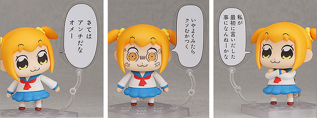 「黏土人 POP子」在原作畫風極度適合的情況下被完美地立體化!表情零件備有讓人超不爽的ω嘴「普通臉」、口水一直流「超酸臉」和極度瘋狂的「暴怒臉」,能配合「超寫實中指」、「揮翅膀」、「肘擊」等爆笑手部零件使用,配件部份附有漫畫中令人印象深刻的「台詞片」,包含「啊~原來如此,我了解了(完全不懂)」「喂~警察嗎?」兩句,以及報警用「手機」、被打爆的「竹O房大樓」,和「黏土人 PIPI美」一同購入更能還原《POP TEAM EPIC》的爆笑場面!