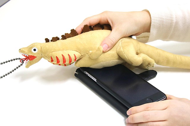 最後一樣商品「哥吉拉 第二型態 螢幕擦拭布偶」全長約 52 公分,造型與抱枕那款類似而且體積相當輕巧,頭部還裝有鍊子能夠隨身攜帶或當成吊飾,腹部縫有柔軟的擦拭布料,不論是電腦、電視、手機,任何螢幕都能拿來擦乾淨喔!