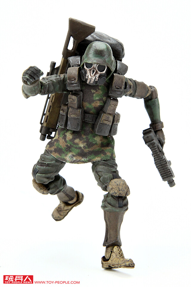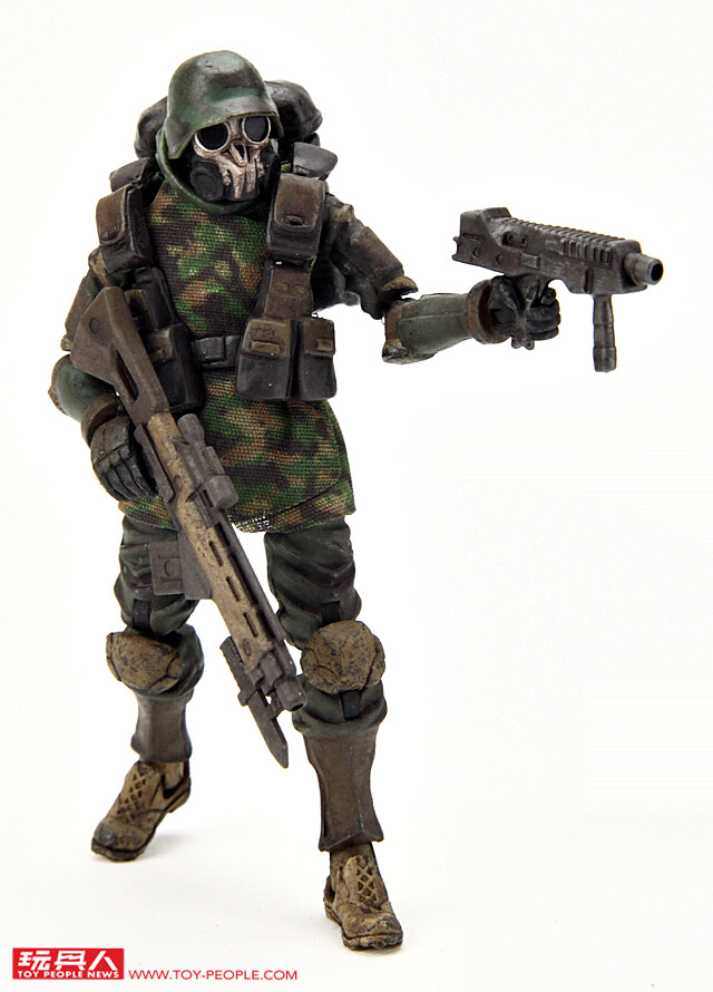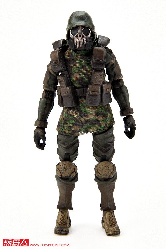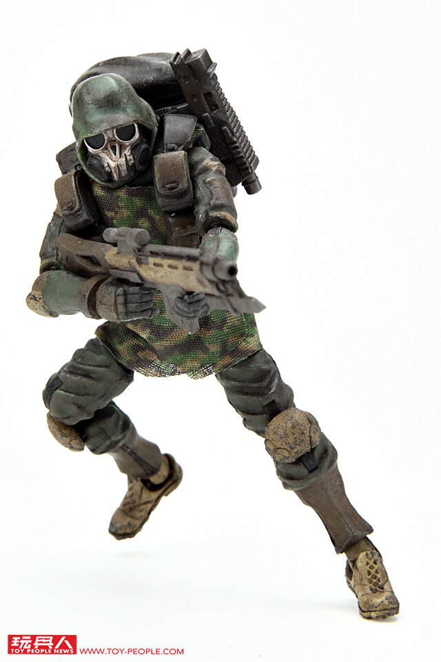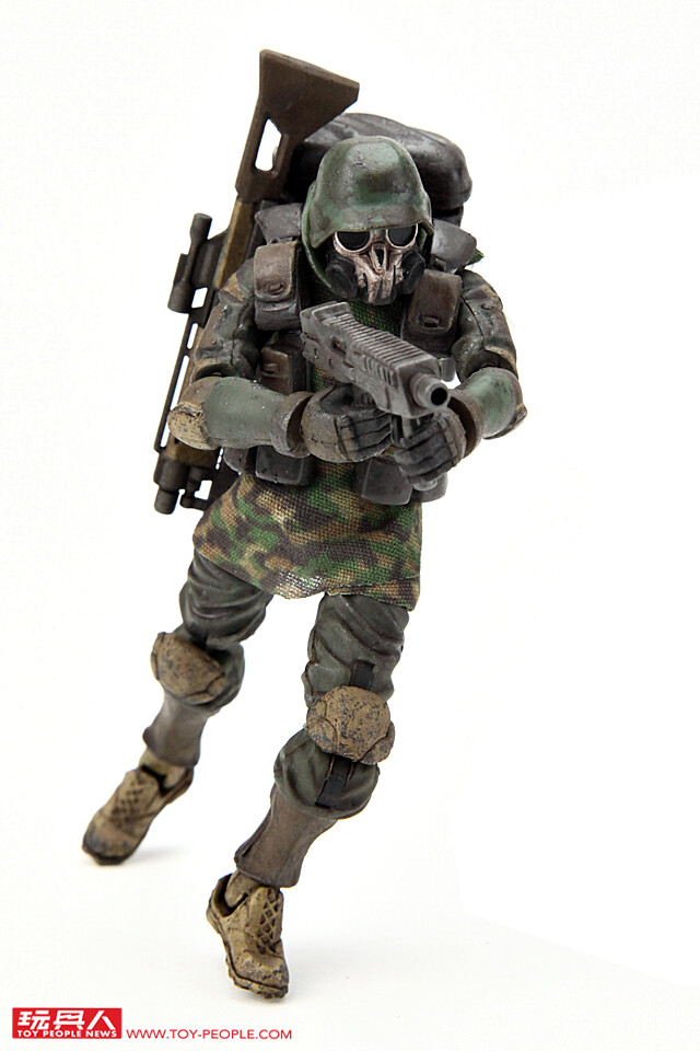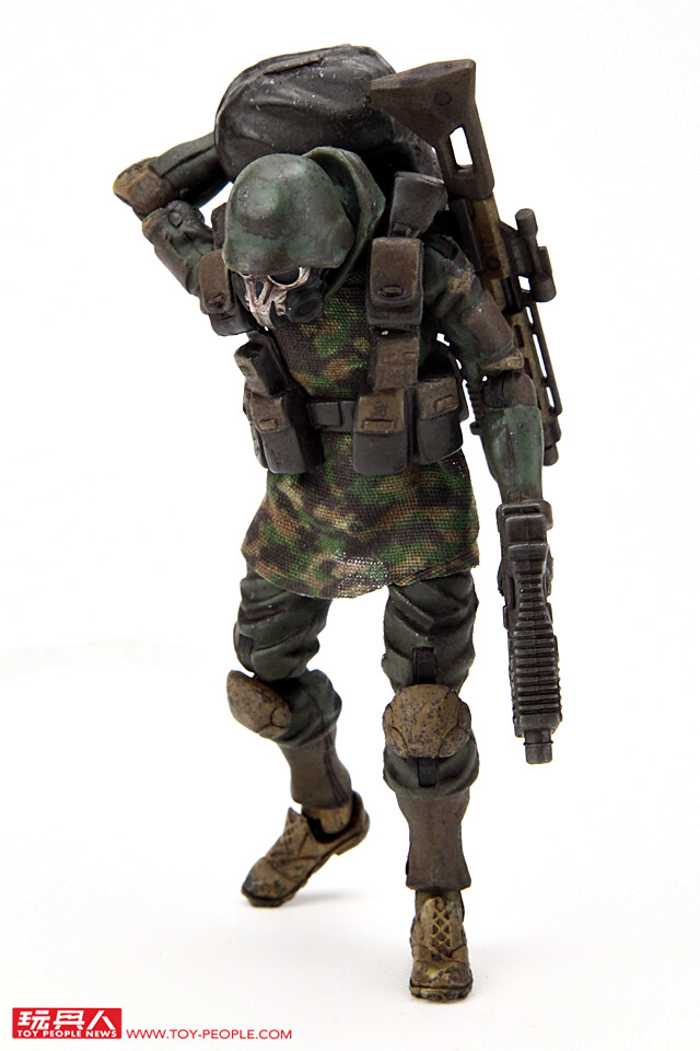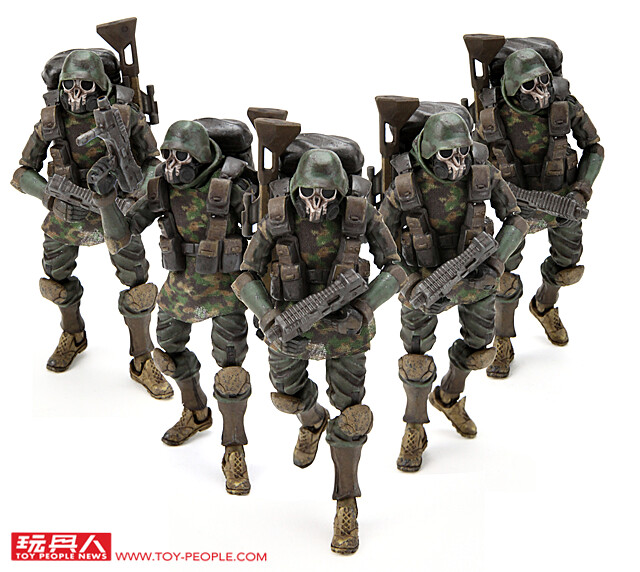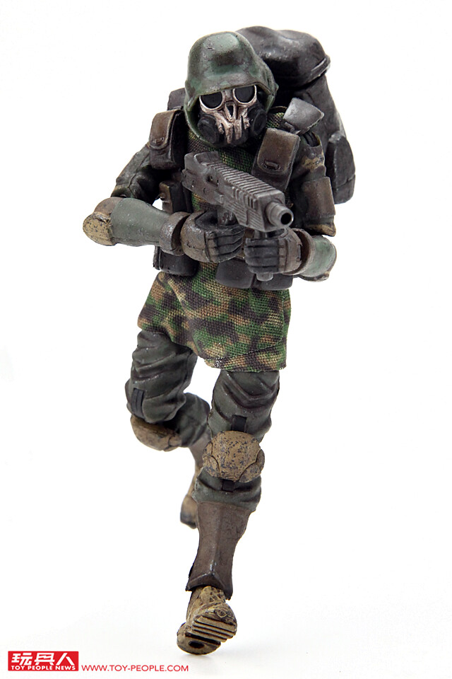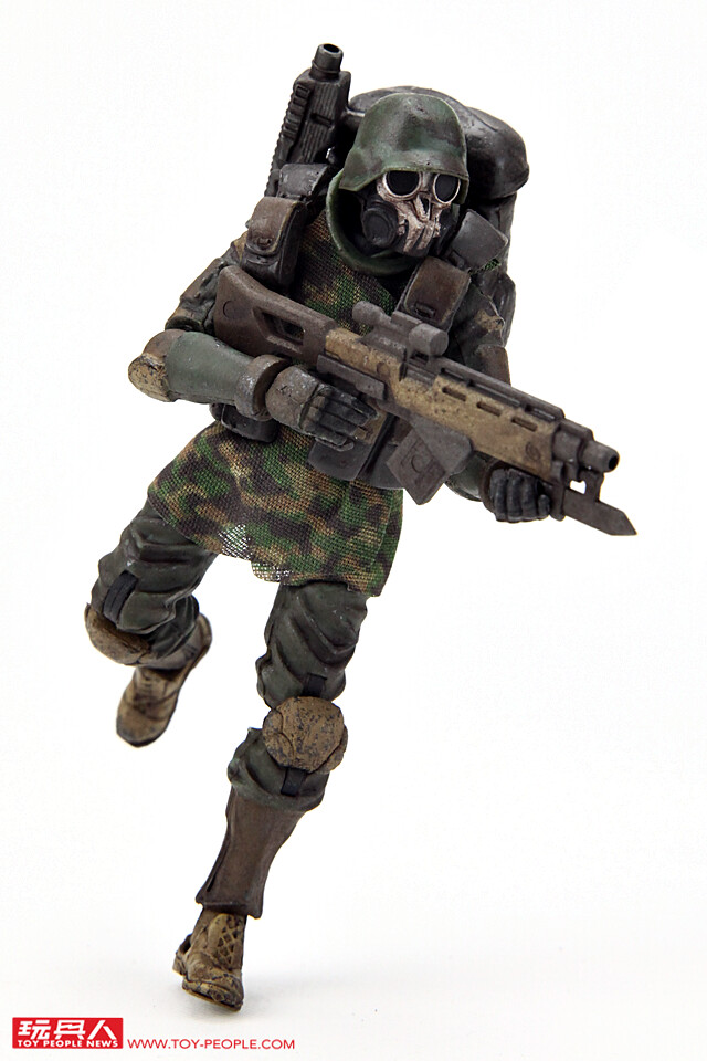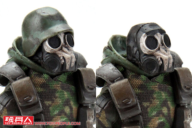 ▼ 第303 海軍陸戰隊最大的特色在於每位士兵的臉部都塗裝了恐怖的白色骷髏頭,搭配上防毒面具上眼睛部位的兩個大黑孔,看起來更加地駭人。 頭盔使用了軟性材質,能夠自由穿脫改變造型,服貼的戴在頭上。