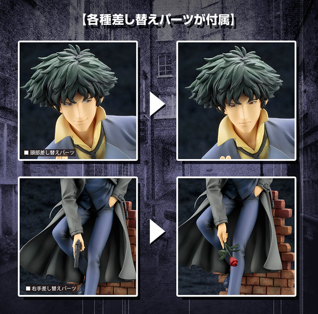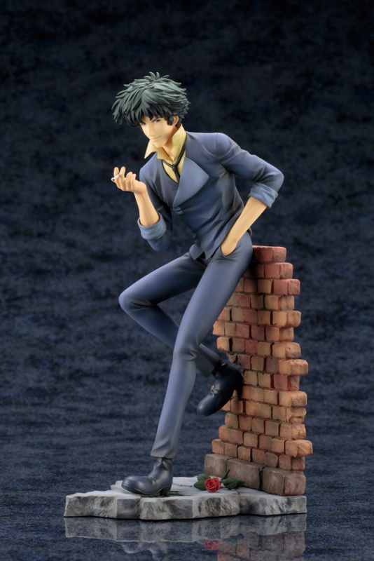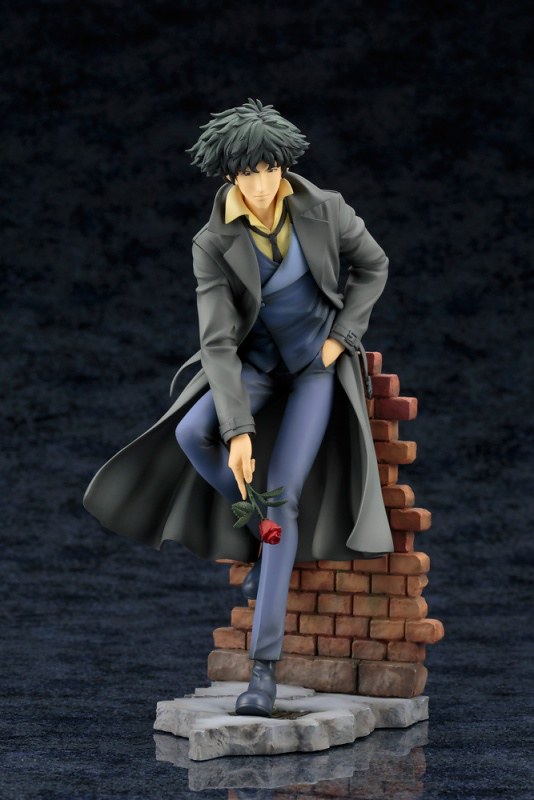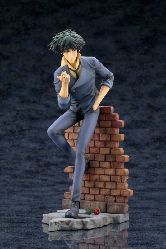 「ARTFX J 史派克·史比格」呈現了史派克倚靠在破碎磚牆的場景,蓬鬆的頭髮與瘦長的身軀等造型完全重現了原作中的姿態,手中拿著特製傑里科941手槍,一臉若無其事的史派克看起來特別帥氣,西裝與大衣的皺摺與微微鬆開的領帶等細節表現細膩。底座的磚牆與水泥地皆有舊化處理,表現出剝落、風化、裂紋等真實質感。落在地上的玫瑰則呼應了動畫第一集中,令人印象深刻的開頭。