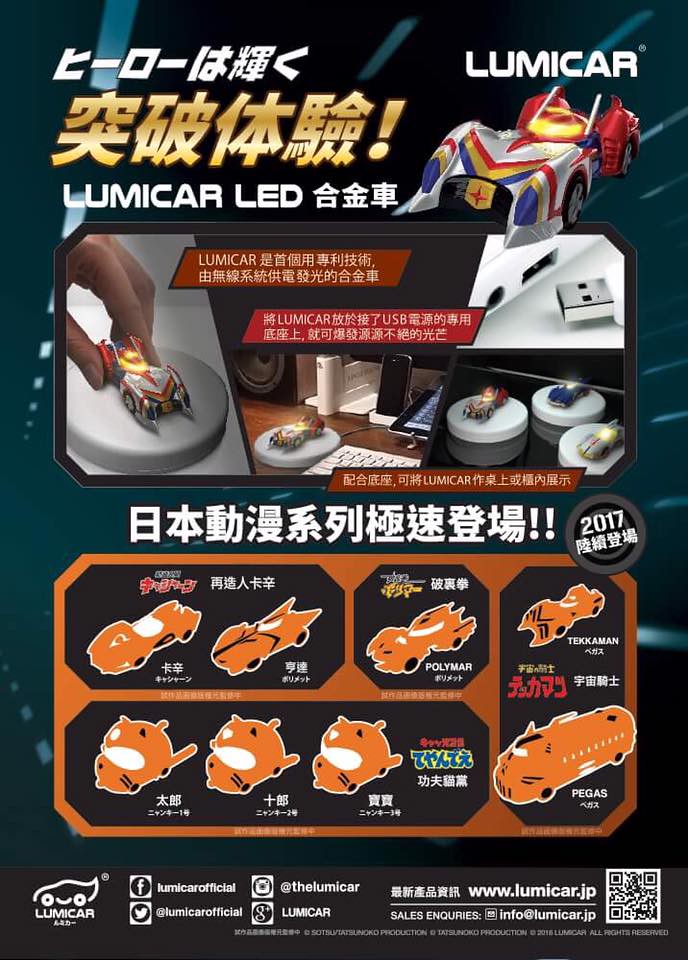 LUMICAR合金車系列榮獲多個日本動漫電玩公司授權,包括著名的「龍之子」及「円谷公司」旗下角色的授權,wonderxwonder公司的設計師注入創意,設計出融合動漫角色外貌特徵的 LUMICAR 合金車。目前正在監修的LUMICAR合金車款式有《再造人卡辛》、《宇宙騎士》及《超人力霸王迪加》等等曾經風摩一時的經典作品,而更多膾炙人口的動漫電玩授權LUMICAR合金車亦正密鑼緊鼓地準備中,將於不久將來陸續來推出新作,請大家務必關注wonderxwonder的LUMICAR系列,留意最新產品的公佈。