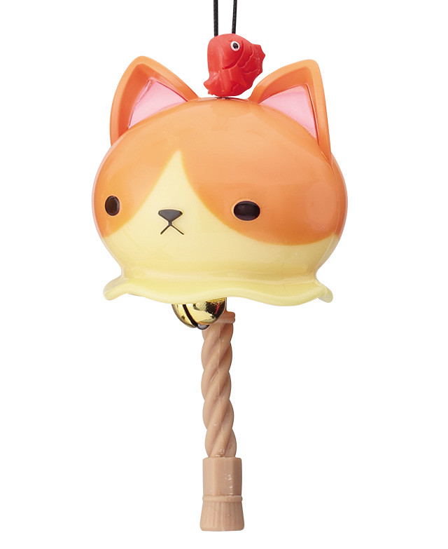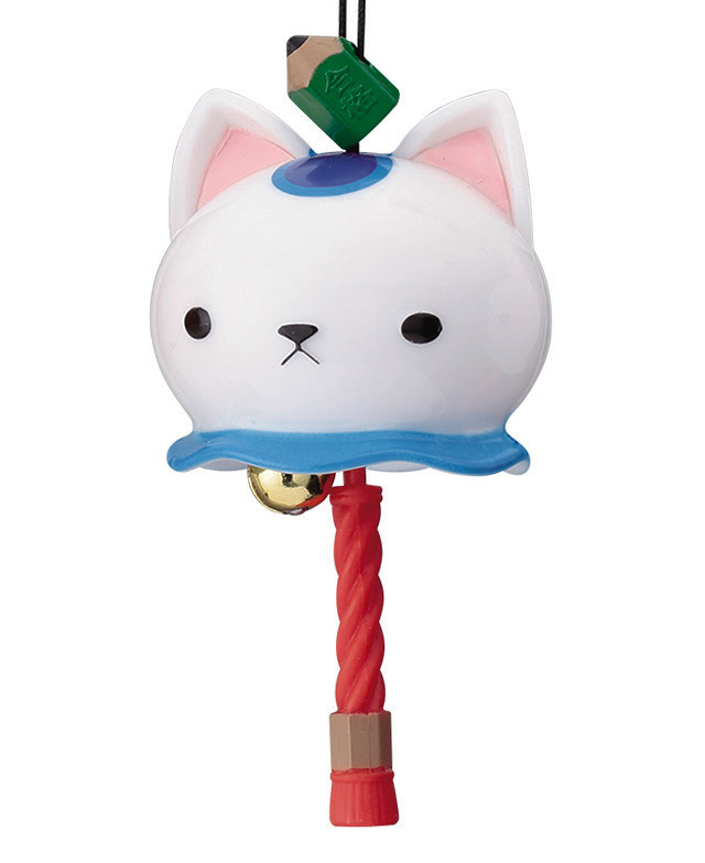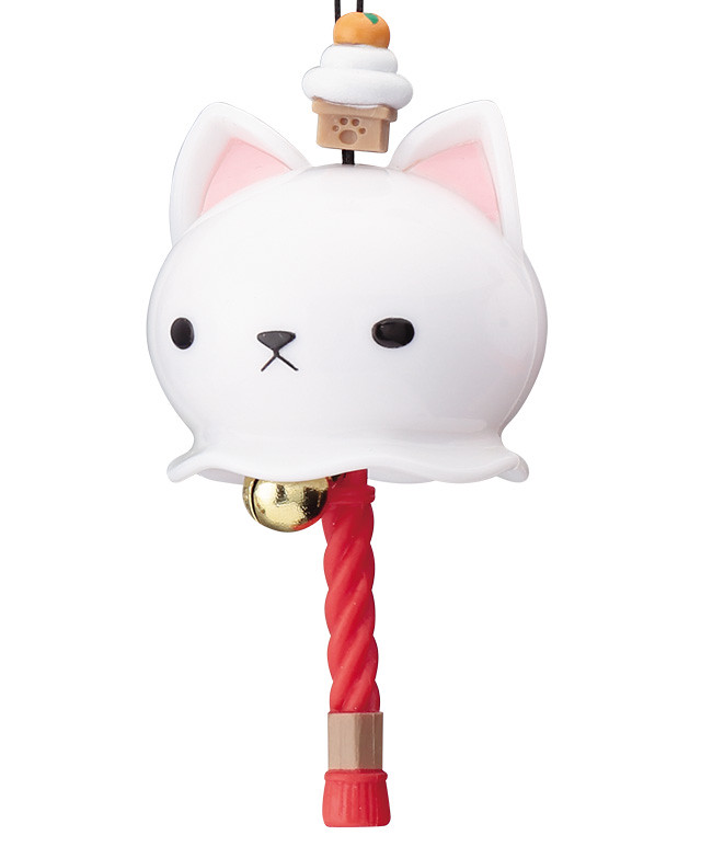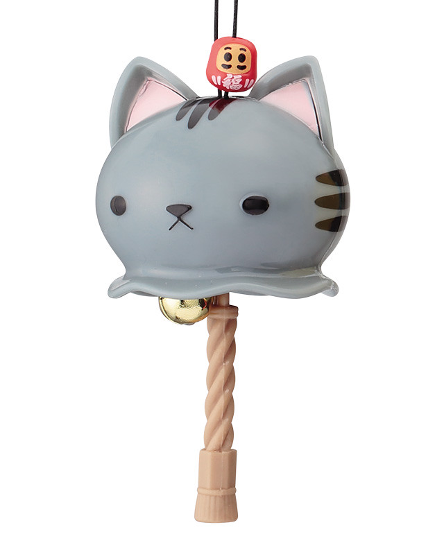 「開運招福 貓咪鈴鐺」結合了貓咪以及神社的鈴鐺與粗繩,在又大又圓的貓咪頭部下方懸掛了鈴鐺與粗繩模樣的零件,能夠像風鈴一樣叮叮地響。每種不同造型的貓咪能夠招來不同的運氣喔!像是頭上掛著「鏡餅」的白貓能夠招福、掛有「福入達摩」的虎斑貓則能去除厄運。
