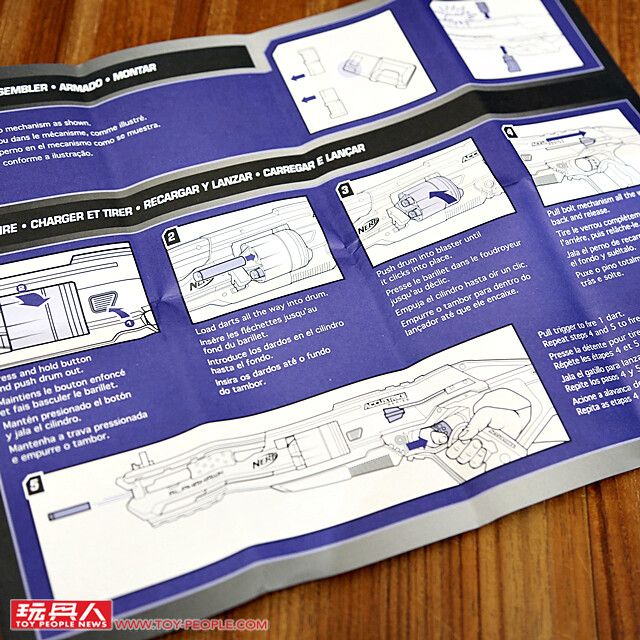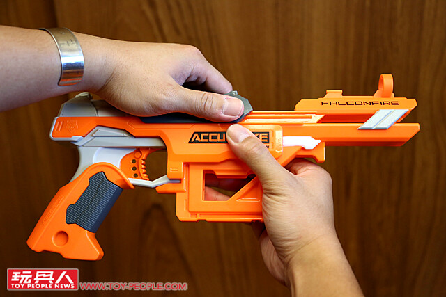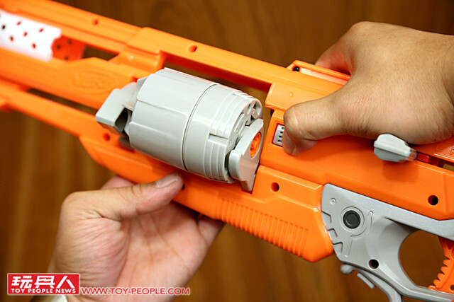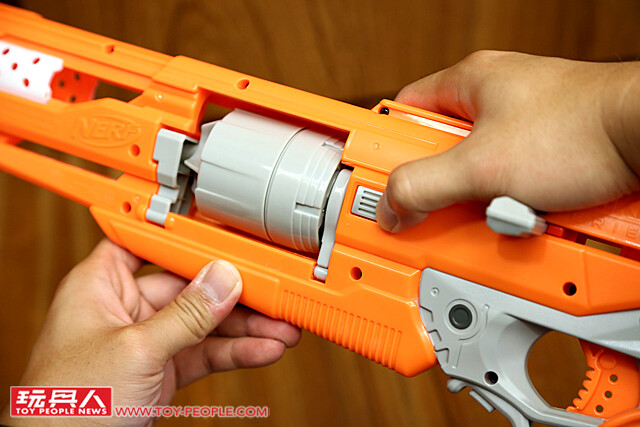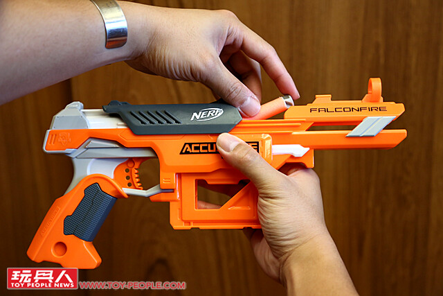 ▼ 為了推廣神射系列,巡弋神射採用的是NERF系列最受歡迎的拉拴式射擊。由於為了縮小包裝方便運輸,所以左右兩側的拉拴握把使用組裝式的設計。組裝相當簡單方便~