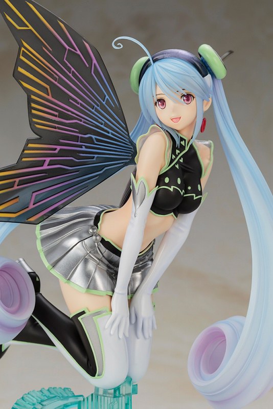 色彩上最為注目的就是翅膀上的紋路,以三種色彩漸層塗裝,呈現出如同雷射貼紙般的色彩。服裝上發光的部份使用螢光綠塗裝還原質感,頭髮為了呈現輕柔的質感使用霧面塗裝降低光澤,產生一種透明的錯覺。底座則是以電子迴路的模樣作為設計,以藍色透明材質製成,上頭有細膩的雕紋及字樣,透光後能映照出漂亮的色澤。