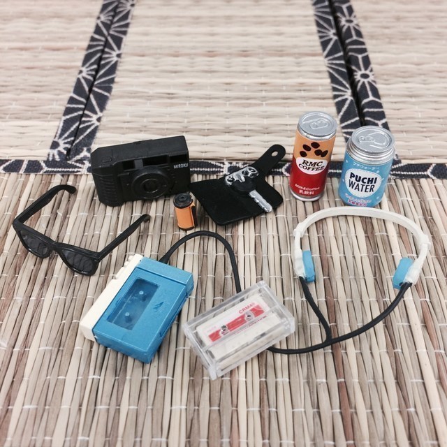 1號/ 超細緻的卡式機和卡式帶, 可自行插入菲林的相機, 太陽眼鏡, 還有兩罐飲料