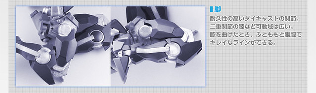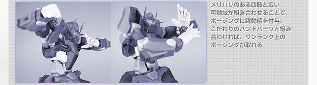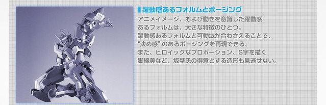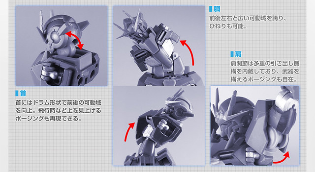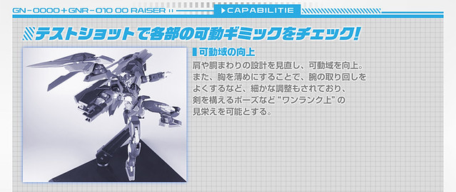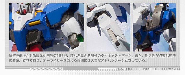 此作的重點在於驚異的可動性能,由於METAL ROBOT魂系列的關節部位都是以合金材質製成,強度與耐久力是非常足夠的。重新調整過的關節結構不同於以往任一件00鋼彈模型,不但可動範圍超廣,腿部還呈現S型的優美曲線,除了能重現動畫中充滿躍動感的印象外,還多了種超級系機器人的氣勢。小巧的尺寸中重現了許多原有的機械設定,例如背包上與0強化戰機的連接點設有隱藏上蓋、兩片GN盾牌的連接點也設計成漂亮的隱藏式...等等。
