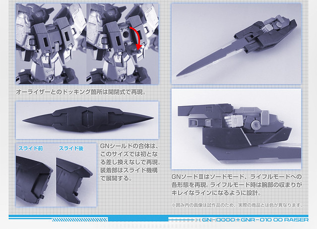 「METAL ROBOT魂 00強化模組(00 Raiser)+GN SWORD III」的比例大約是1/144,全高約 130mm,著重在重現動畫中的設定,因此外觀相當乾淨洗練,線條銳利有型。擔任設計的是擅長「原作重現」、「大張風格」,曾製作「超合金魂 GX-68 我王凱牙 GaoGaiGar」的 坂埜龍。除了OO鋼彈的本體與0強化戰機(0 Raiser)外,還附有GN劍 II、GN劍 III、GN 盾牌等武裝。