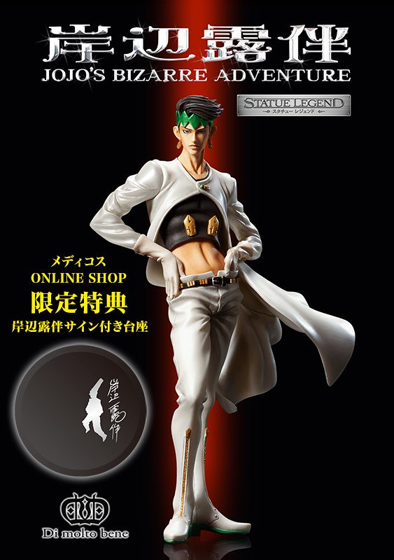專門推出精緻造型玩具的日Di molto bene品牌這次將推出"完全受注限定生産"的《JoJo的奇妙冒險》第四部主要角色「岸邊露伴」,經常被喜愛JoJo的漫迷粉絲們認為「岸邊露伴」這個角色人物是「荒木飛呂彥」老師本人的個性投射,不僅是有著職業是"漫畫家"的設定,連劇中堅毅不屈的性格也和老師謀合相似,還有老師本人也十分喜愛這個角色,也有多部「岸邊露伴」單獨漫畫篇章來描寫他另外的冒險劇情像是《屹立不倒的岸邊露伴》。