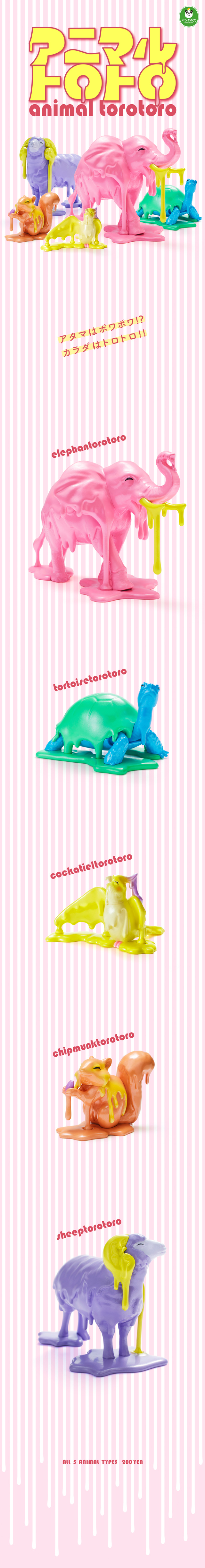 這次首度於展覽「パンダの穴9日展」上展出的作品,是以熊貓之穴相當擅長的動物主題來製作,將我們所熟悉的多種動物們化身為各種鮮豔配色,並且搭配上融化的質感,呈現出極為超現實的特色造型與嶄新風格。 目前預計推出五種款式,包括:大象、綿羊、烏龜、鸚鵡與松鼠。