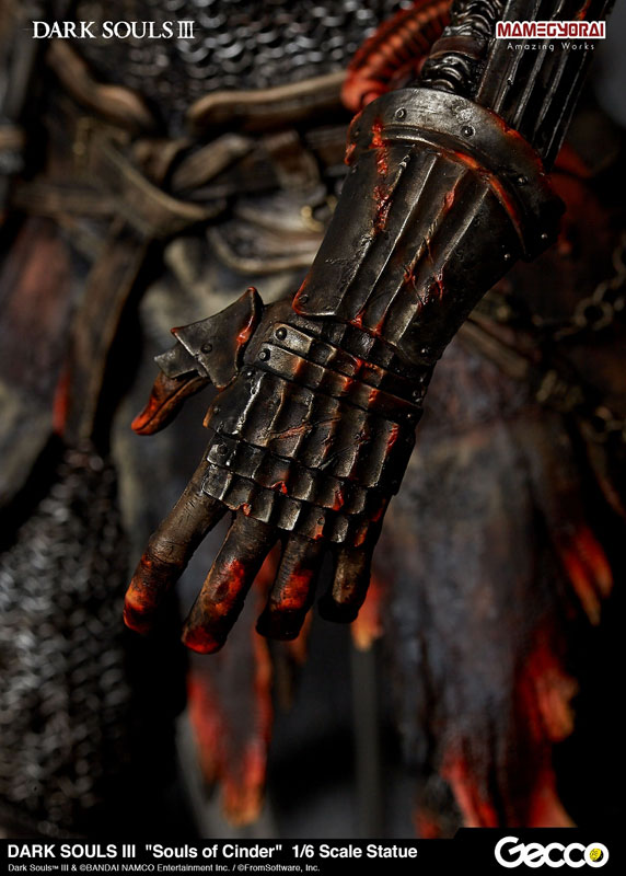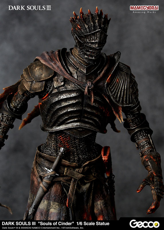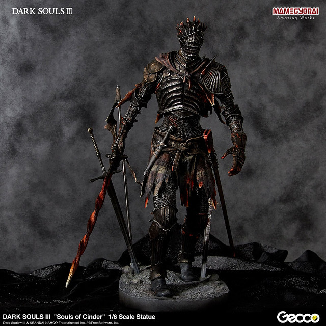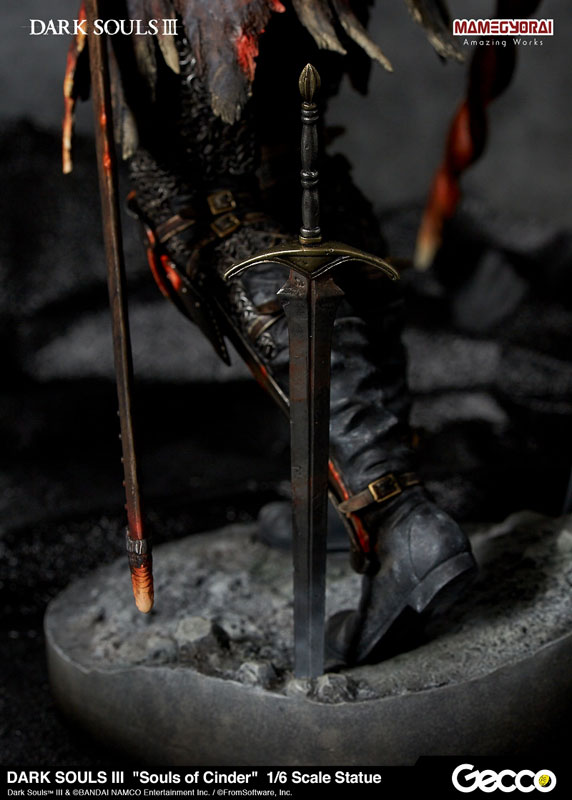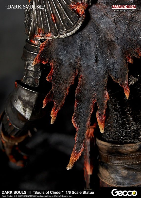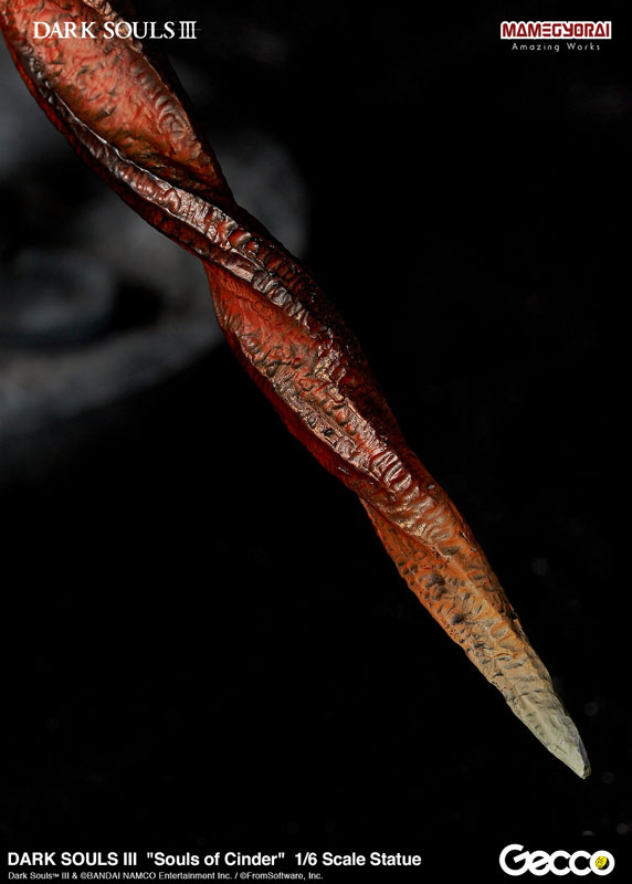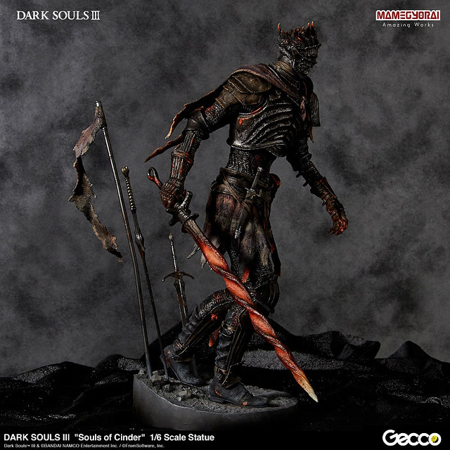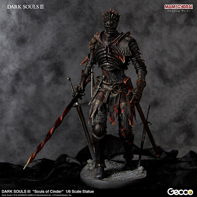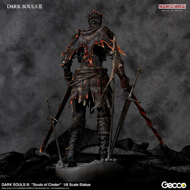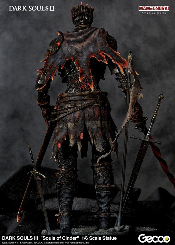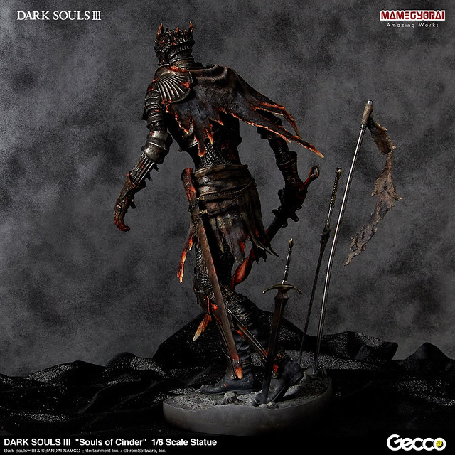 Gecco推出的「薪王們的化身」由From Software的設計團隊完全監修,身上的皮革、布料、金屬都打造出相當真實的質地,而且上頭的細節例如污漬、傷痕、補丁都非常精緻,連鎖子甲都是環環相扣編織上去的。燃燒的部份則用一系列的暖色系表現,不但具有層次,連燒焦、熔化的效果都完美呈現。底座則重現了遊戲中的戰鬥場景:砂石地上插滿了數百把劍,薪王們的化身發現你後,緩緩地朝你走了過來...。預約特典則贈送1/1大小的遊戲道具「餘火」,並附有磁吸式專用臺座能夠單獨展示。