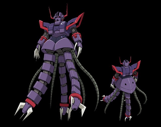 在《鋼彈創鬥者》中由鋼普拉黑手黨刺客所使用的MSN-02MR水戰地獄吉翁號,裙底裝有三條內置米加粒子砲的伸縮爪臂,可把敵人拖下水,進行對己方有利的水中戰。腳只是裝飾品...