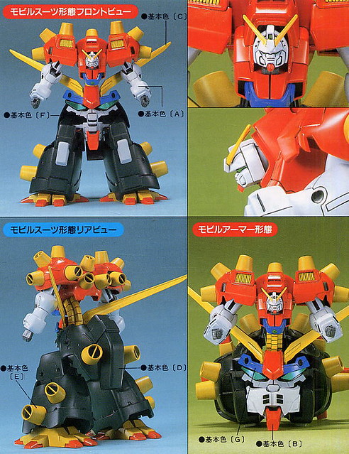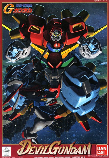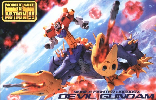 《機動武鬥傳G鋼彈》的最終大魔王惡魔鋼彈,是火州博士開發的究極鋼彈,能夠自我再生、自我增殖、自我進化的機械生物,造型恐怖不說,還能生出一堆鋼彈頭觸手和死亡軍團小兵。動畫中出現過四個型態,第一型態是具有龐大身軀、多足、巨大爪嵌的魔物造型,曾推出過MIA系列可動玩具,也出過BB戰士。第三型態的雙腿能夠變成巨大鋼彈頭,曾推出1/144模型,最近少量再販,想收的朋友可以留意一下。