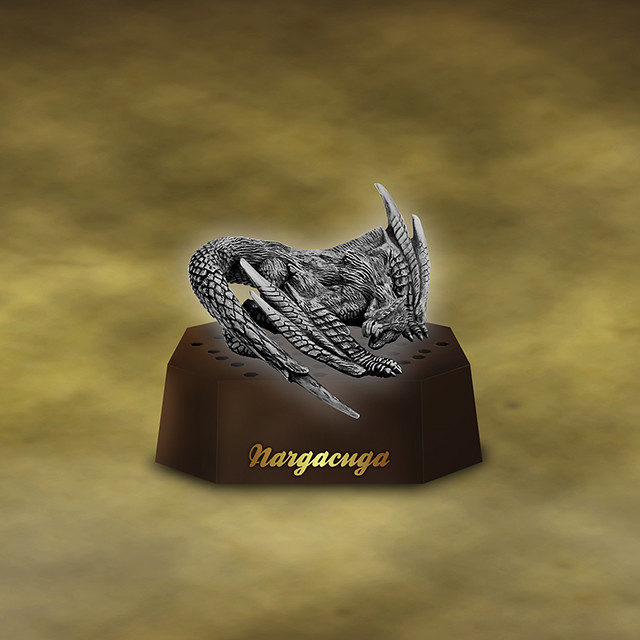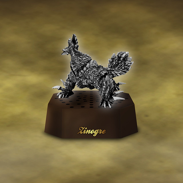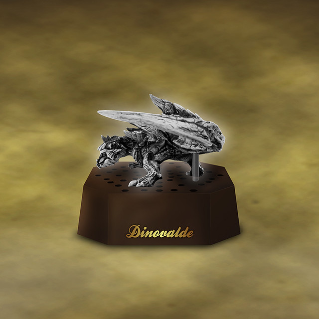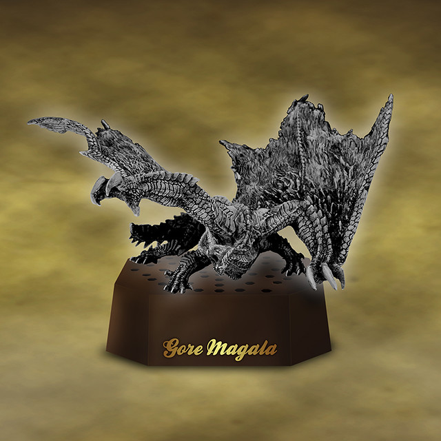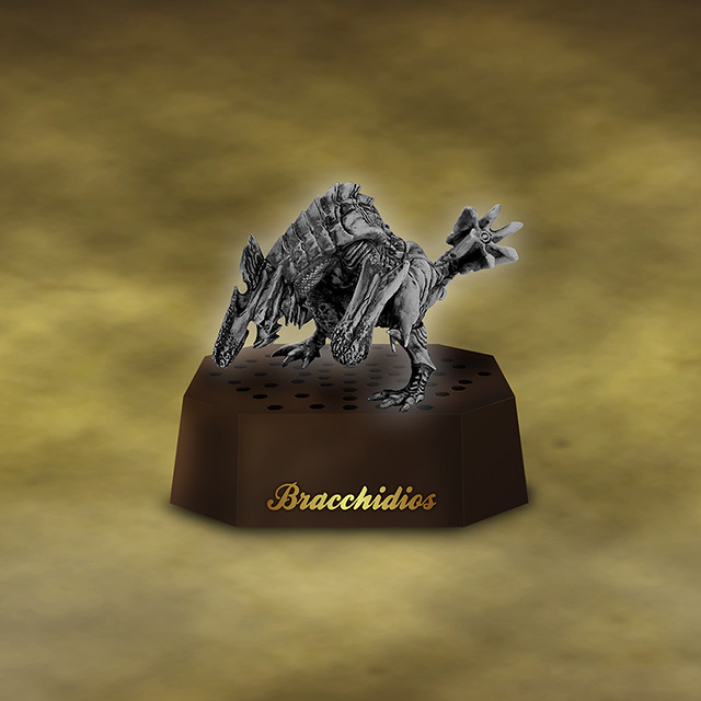 模型本體的高度約 100~150mm,附加的底座上有著用亮金色寫下的魔物名字,增添了高級感。各個商品內還附有「Bonus零件」,湊滿六種零件後就能組合成第7種魔物:同樣是石像造型的「斬龍 ディノバルド」。