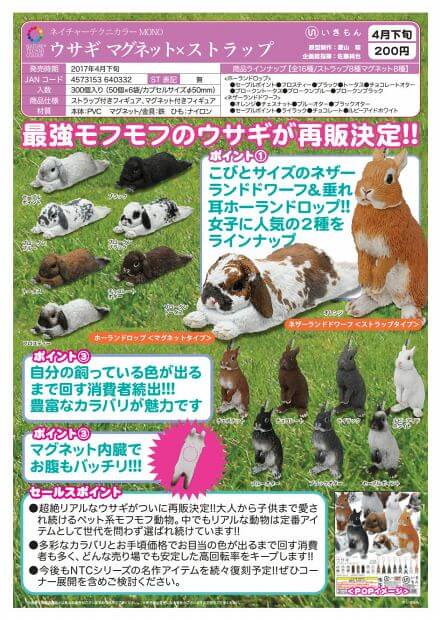 日奇譚俱樂部與株式会社いきもん合作推出相當熱賣的「自然色彩(NATURE TECHNI COLOUR)」轉蛋系列,裡面有一款十分受歡迎的「小兔 磁鐵×吊飾」ウサギ マグネット×ストラップ(名稱暫譯)動物轉蛋之作,將於明年"再次販售"來復刻推出了啊!