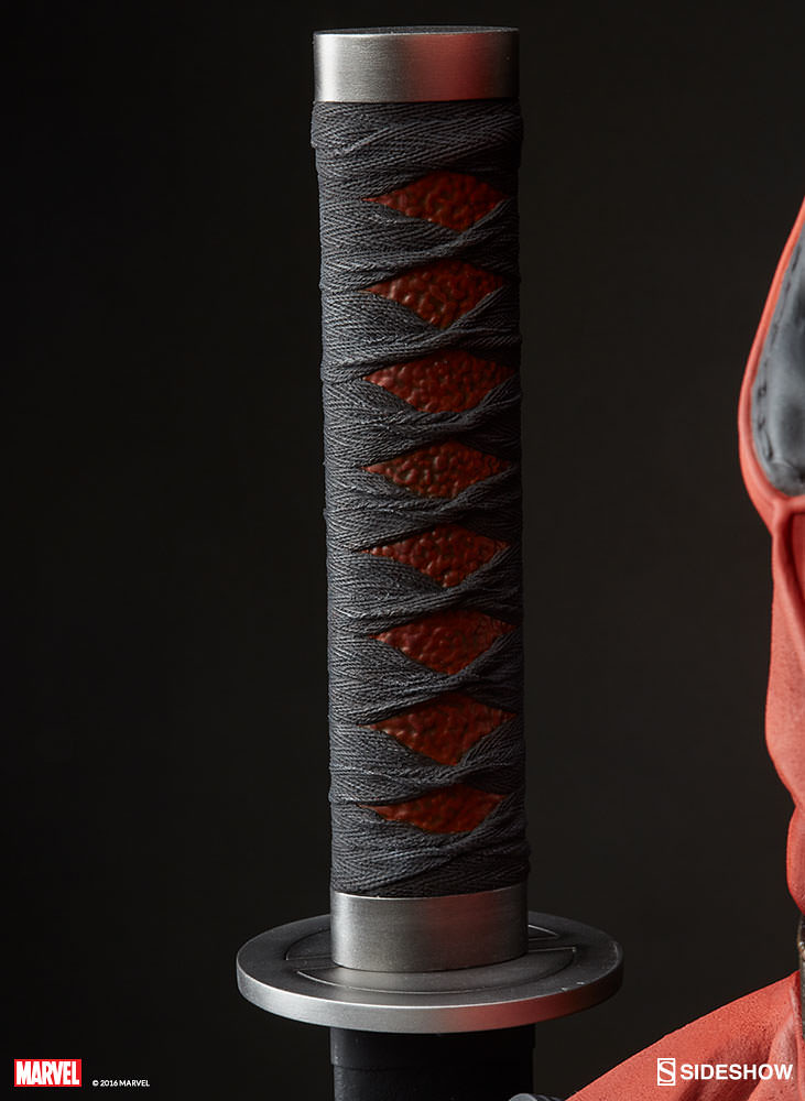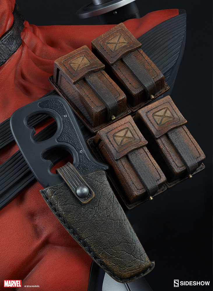 這次所推出1:1 真人比例的「死侍」韋德.威爾森半身胸像作品可說是相當符合死侍爆笑幽默的無厘頭性格啊!特別是在臉部表情的部分採用大、小眼向右上方望去的造型,彷彿就是要跟你一起自拍一番。此外,在身上武器的部分,除了背後所掛的兩把雙刀之外,胸口還有彈夾袋、小刀以及兩顆死侍風格手榴彈。每一個雕像都是採用純手工的上色,高品質的上色技術以及細節處理,絕對是喜歡死侍玩具人不可以錯過的一款胸像作品。